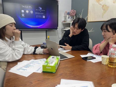 月に1回、韓国語教室のミーティングを行っています。普段はシフト制のため、講師2名と堤、教室長が一堂に会する機会が限られます。